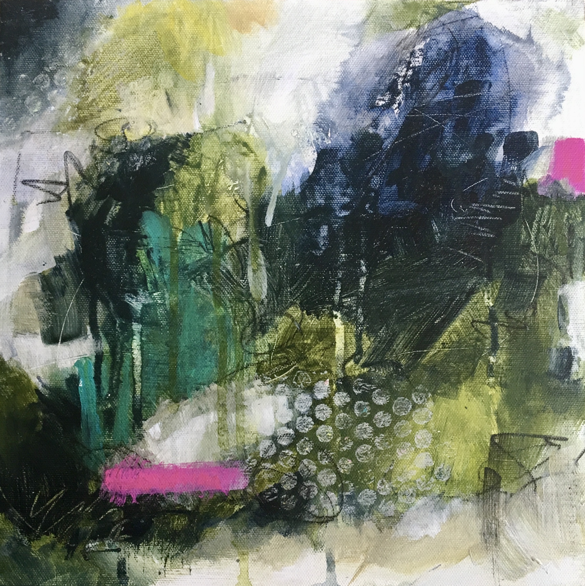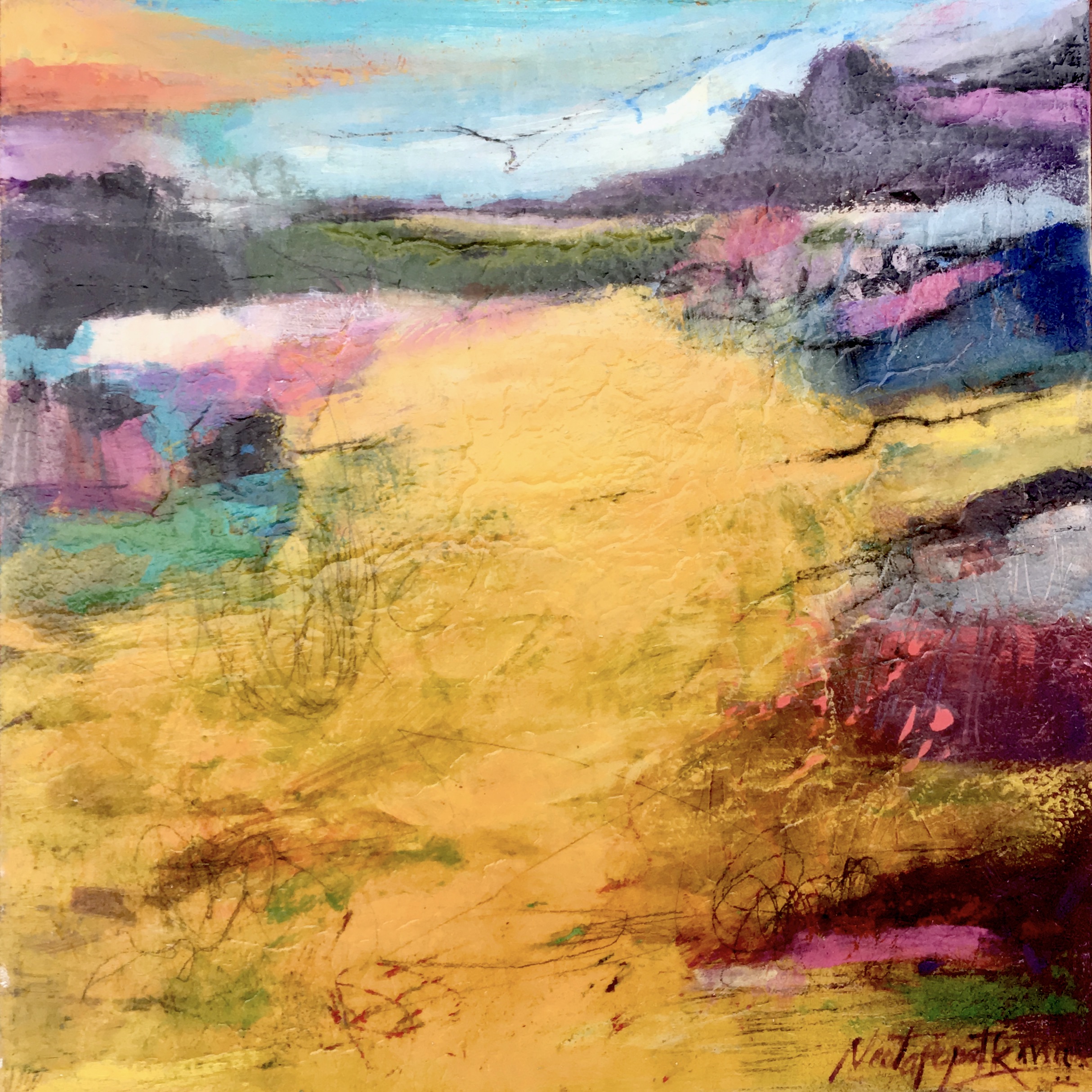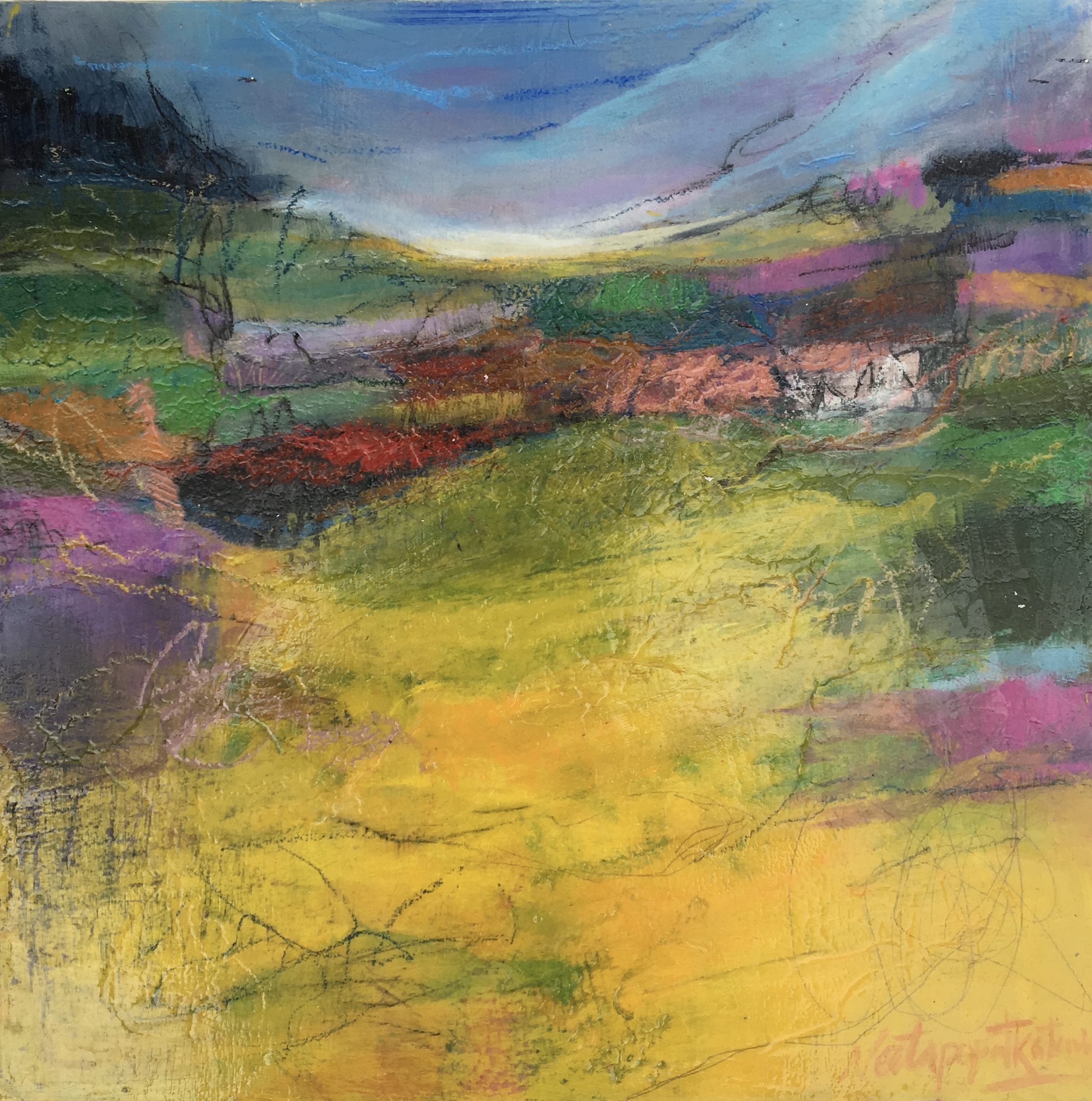 These mysterious, atmospheric landscapes, have been made with paintbrushes, scratching, glazing, and printing. I’ve added myself, my personality and flavour to these landscapes. There is much more to discover and I’m excited by the continuation of my journey into the unknown.